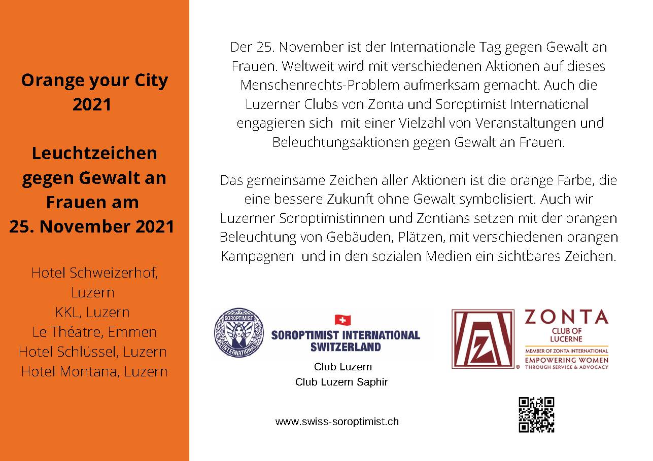 Die Orange Days sind eine internationale Kampagne, welche vom 25. November – dem Tag gegen Gewalt an Frauen – bis am 10. Dezember – dem internationalen Menschenrechtstag – läuft. Auch die beiden Soroptimist Clubs Luzern und Luzern Saphir und der Zonta Club Luzern haben gemeinsam ein Zeichen gegen Gewalt an Frauen gesetzt: Die Fenster des Hotels Schweizerhof Luzern, das KKL-Dach, das Hotel Montana, Le Théatre in Emmen und das Hotel Schlüssel leuchteten am Donnerstagabend, 25. November in der Aktionsfarbe Orange. Mitglieder der drei Frauen-Clubs verteilten dazu Info-Material an die Passantinnen und Passanten.