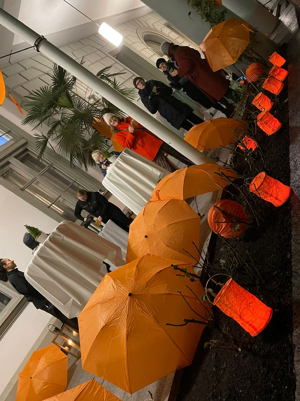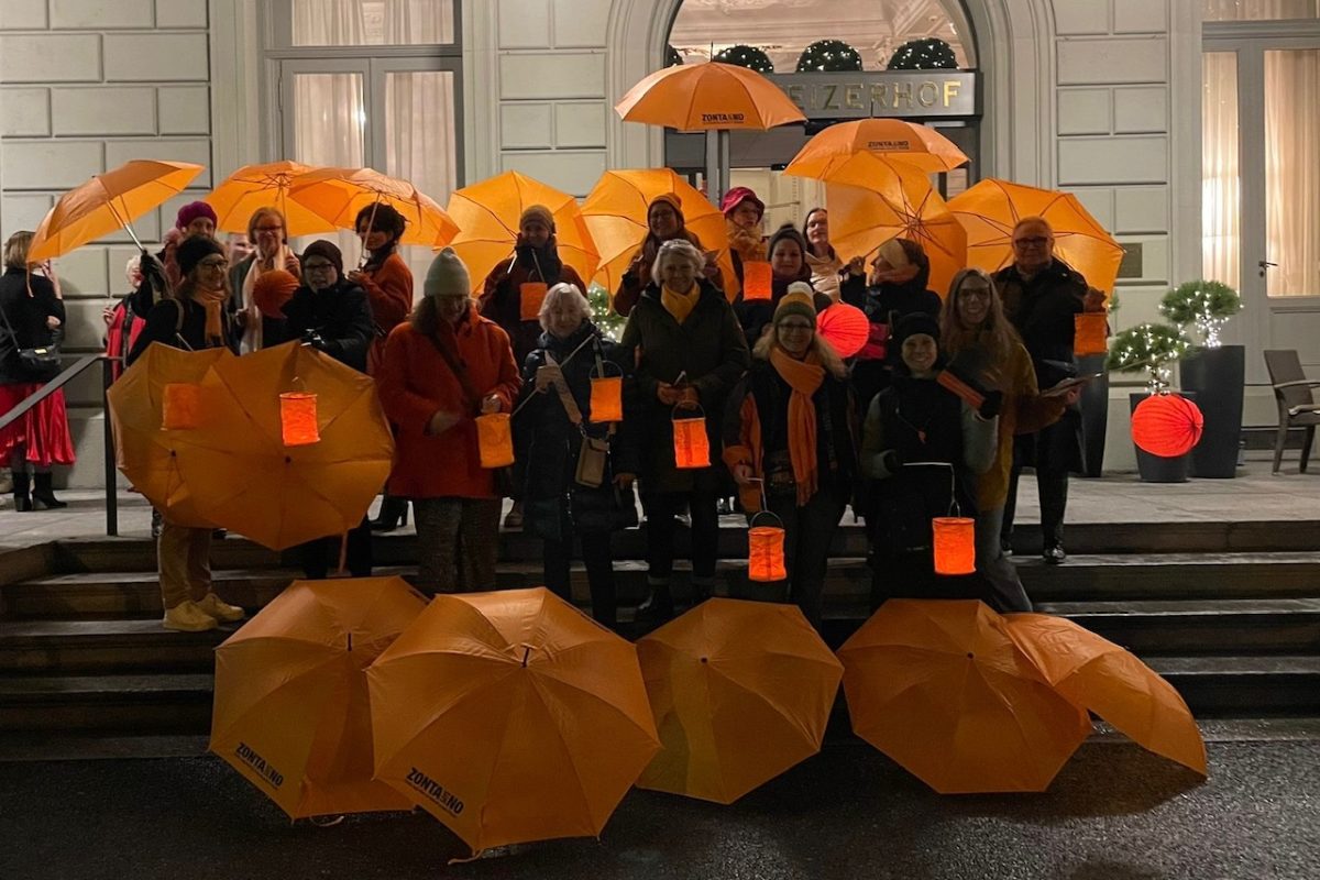 Zontians und Soroptimistinnen versammelten sich beim Hotel Schweizerhof und gemeinsam ging’s auf den Orange-Day-Walk mit orangen Schirmen und Lampions zum Restaurant Schlüssel.