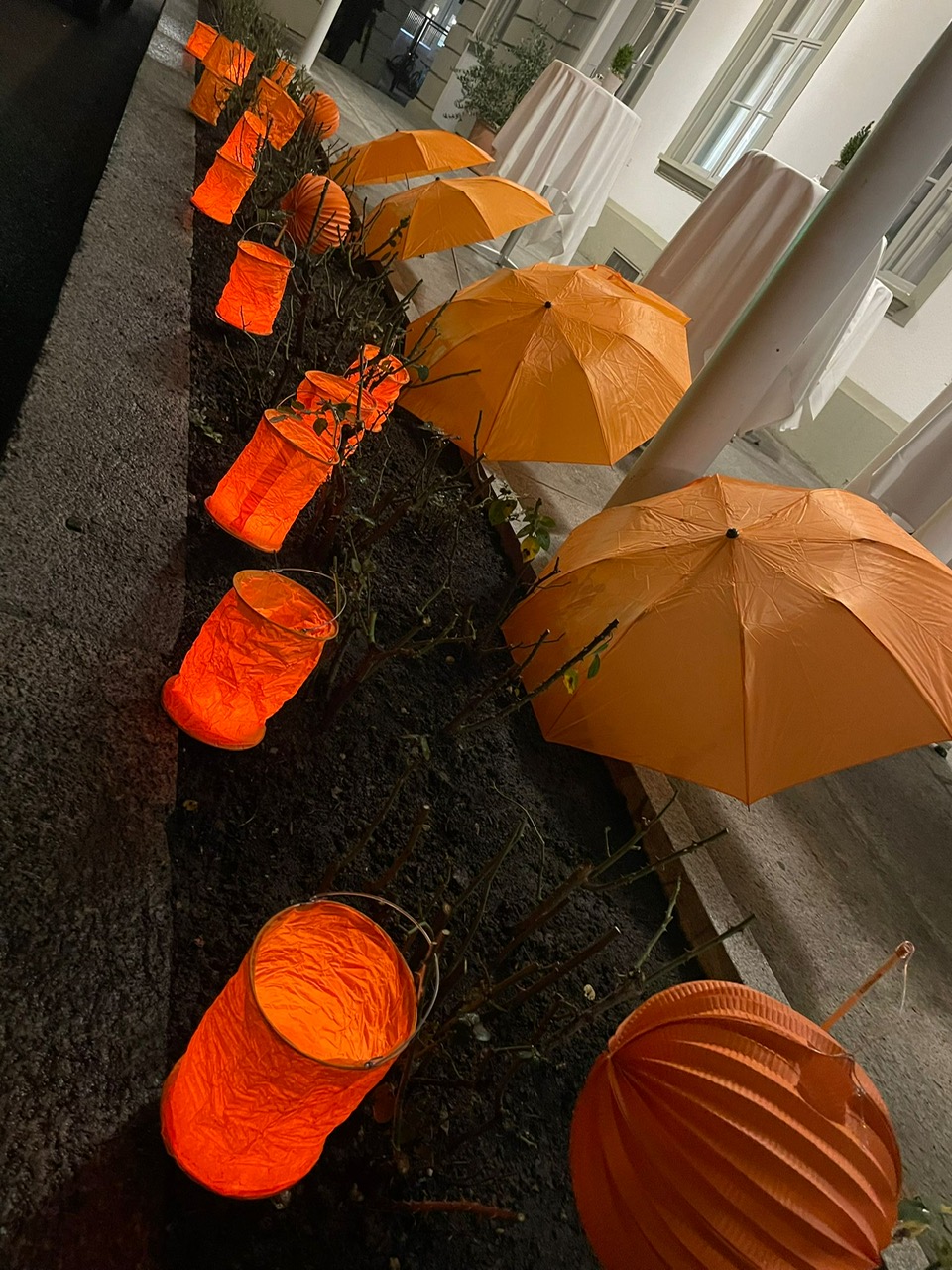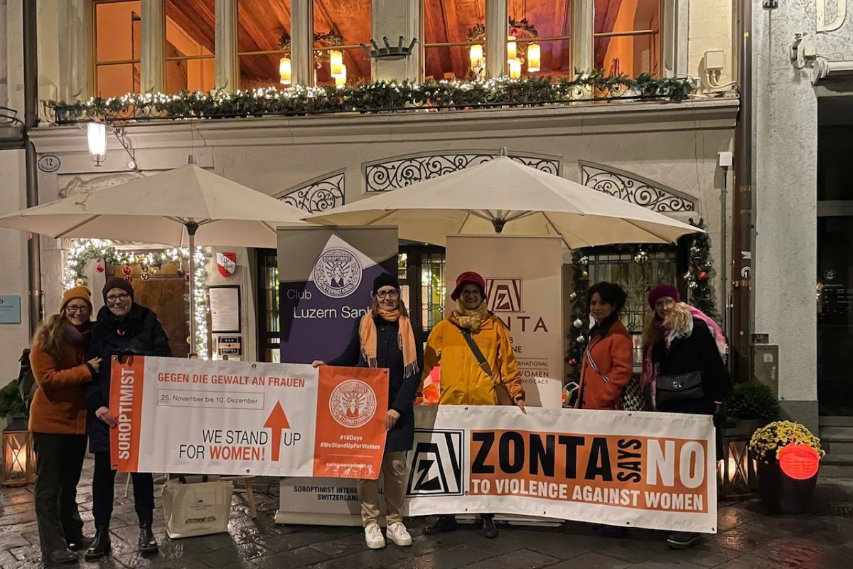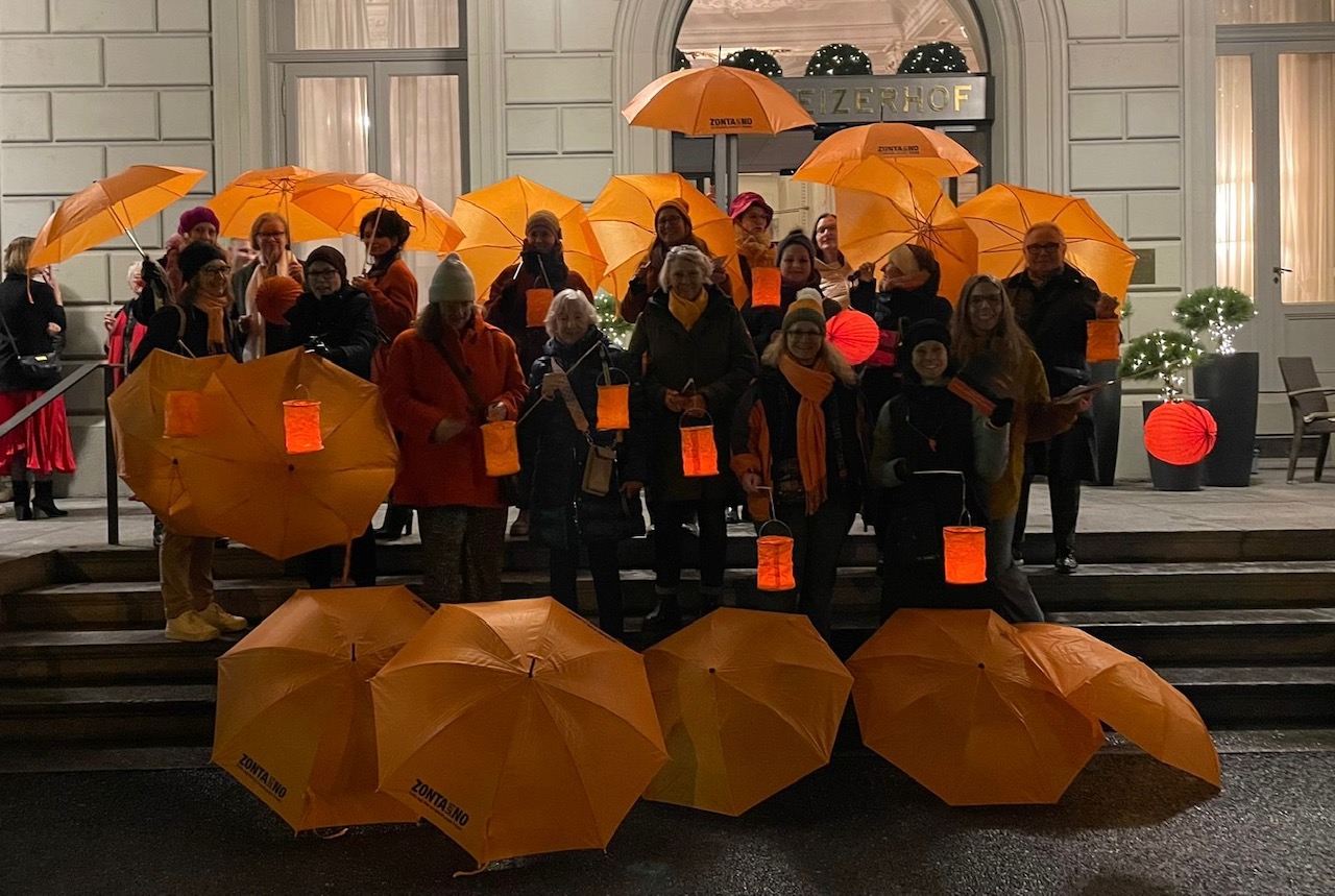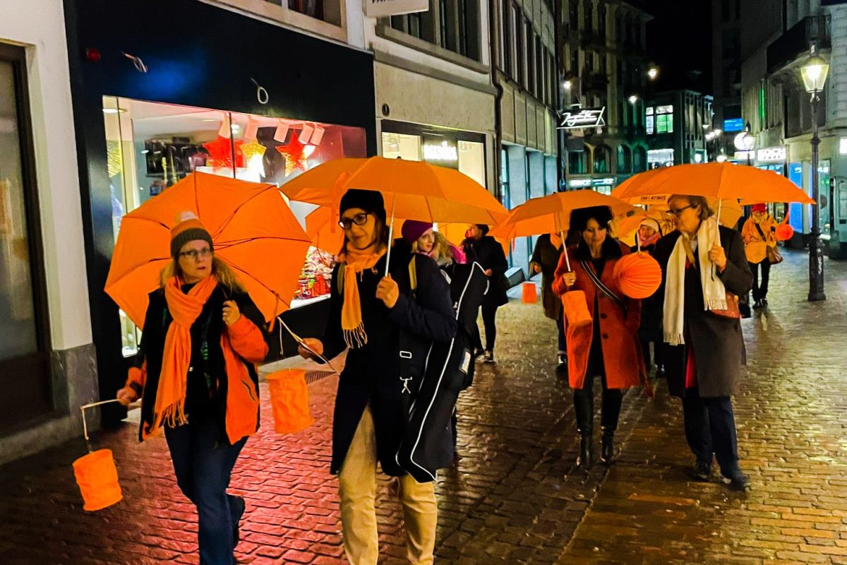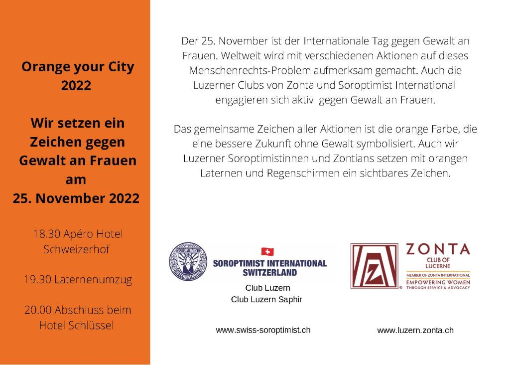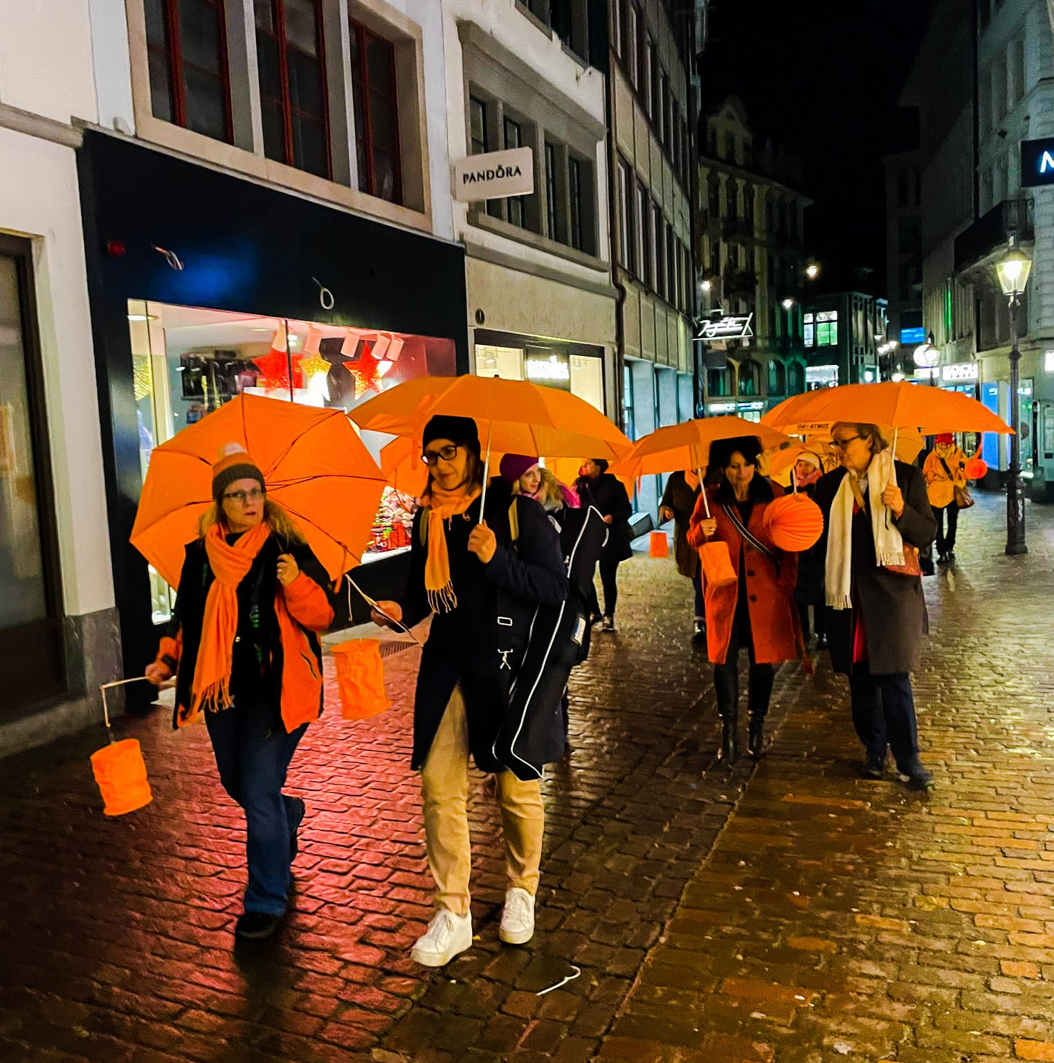 Das gemeinsame Zeichen aller Aktionen ist die orange Farbe, die eine bessere Zukunft ohne Gewalt symbolisiert. Auch die Luzerner Soroptimistinnen und Zontians setzten am 25. November gemeinsam mit einem Marsch mit orangen Lampions durch Luzern ein Zeichen gegen Gewalt an Frauen.